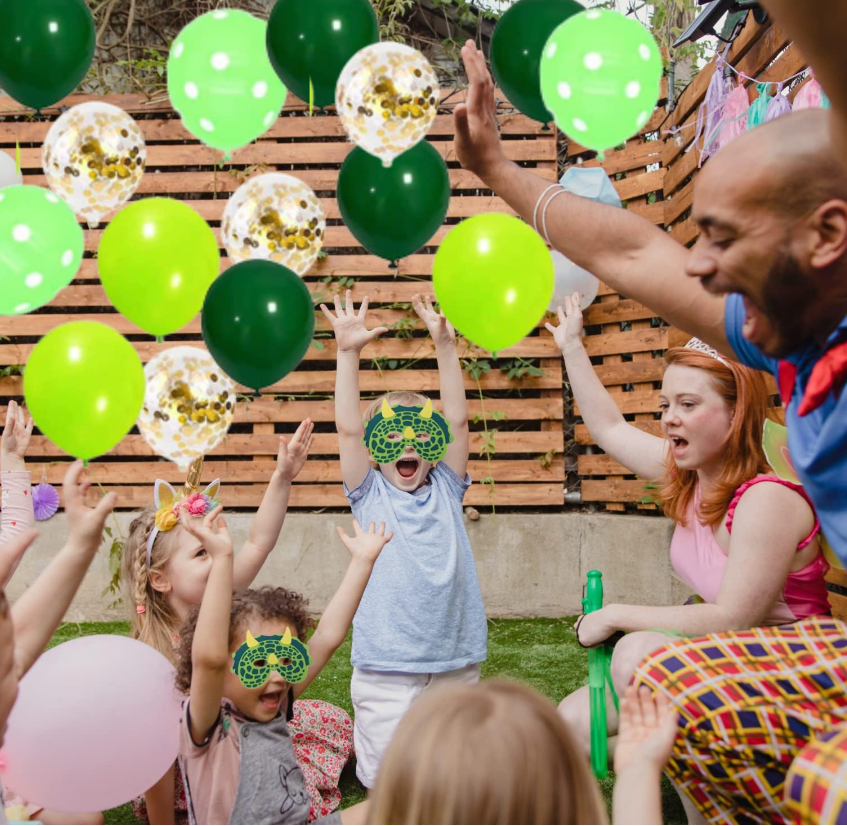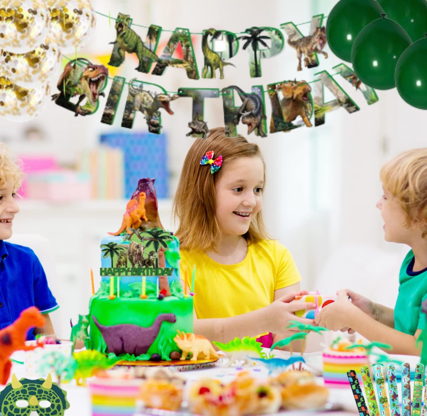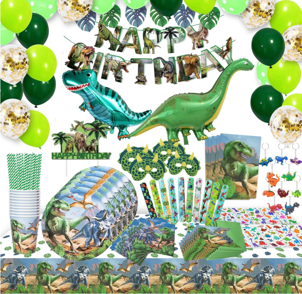 Pancarta «Happy Birthday, 2 dinosaurios papel aluminio, 6 globos de latex verdes de lunares, 6 globos de latex verdes jungla, 6 globos de latex verdes jade, 6 globos de latex confeti, 10 invitaciones para amigos, 10 pajitas de papel, 1 cake topper, 10 platos de cartón, 10 servilletas de papel, 10 vasos de cartón, 1 mantel jurásico, 6 palmeras de 2 colores, 10 pulseras, 100 stikers, 10 llaveros y 10 bolsas de regalo para invitados